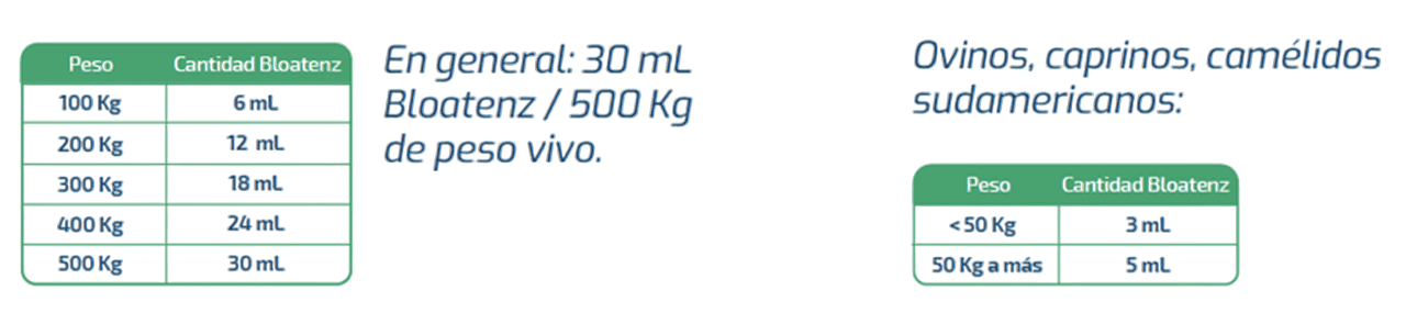 Dosis preventiva: Individual: Diluir 30 mL de Bloatenz en 1 L de agua limpia y administrar 250 mL de esta solución a cada animal, 2 veces al día. Colectivo: Disolver 30 mL de Bloatenz en el bebedero por cada 10 L de agua limpia.