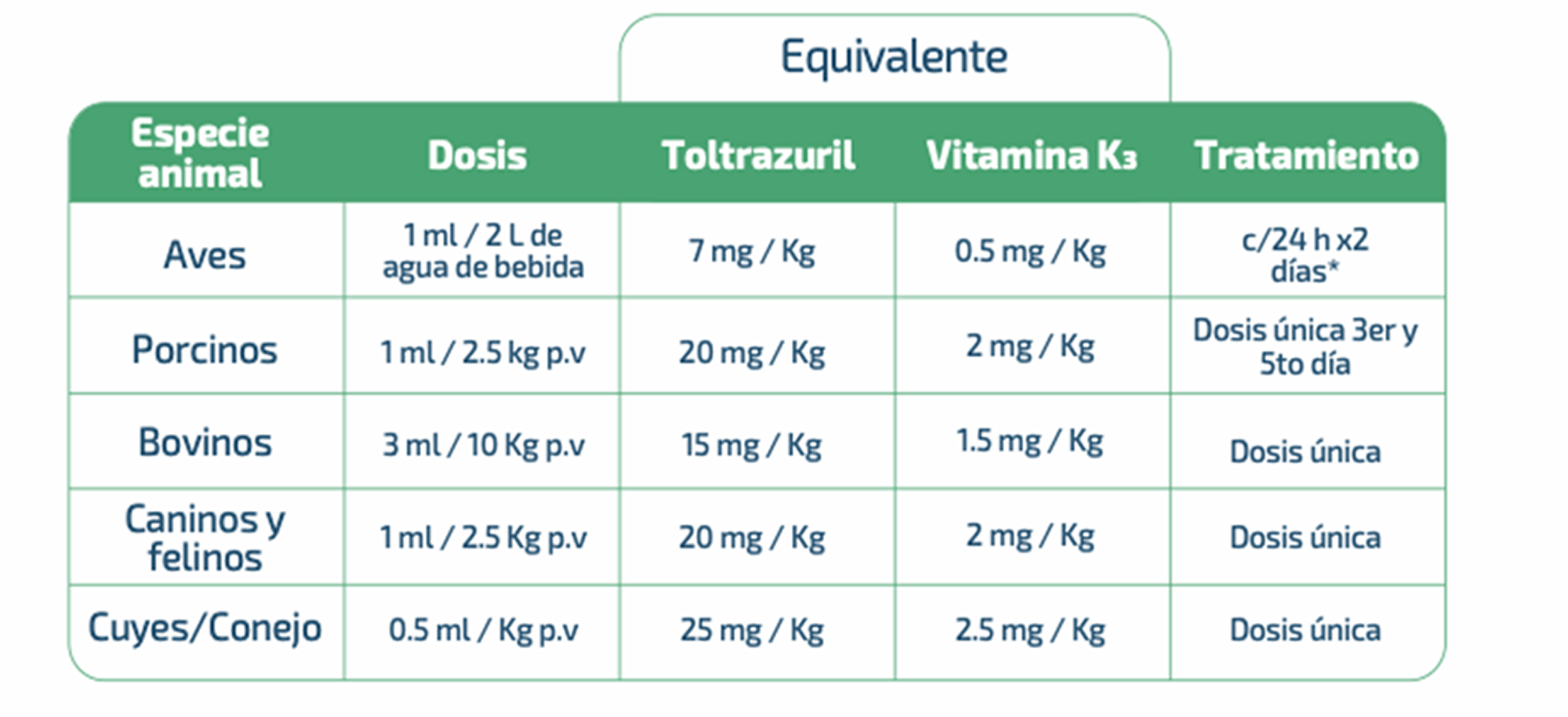 1 mL contiene: Toltrazuril 50 mg, Vitamina K3 5 mg y excipientes c.s.p. 1 mL.